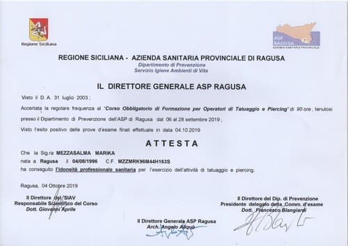 Il nostro studio opera nel rispetto delle normative igienico-sanitarie per l'esercizio dell'attività di tatuaggio, piercing e sopracciglia rilasciata dalla Regione Sicilia e da altri enti nazionali.